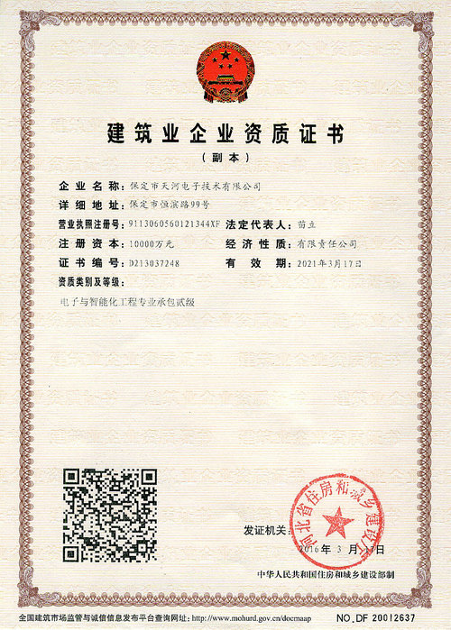 2016年4月,天河電子取得河北省住房和城鄉(xiāng)建設廳頒發(fā)的建筑智能化工程專業(yè)承包貳級資質(zhì)。